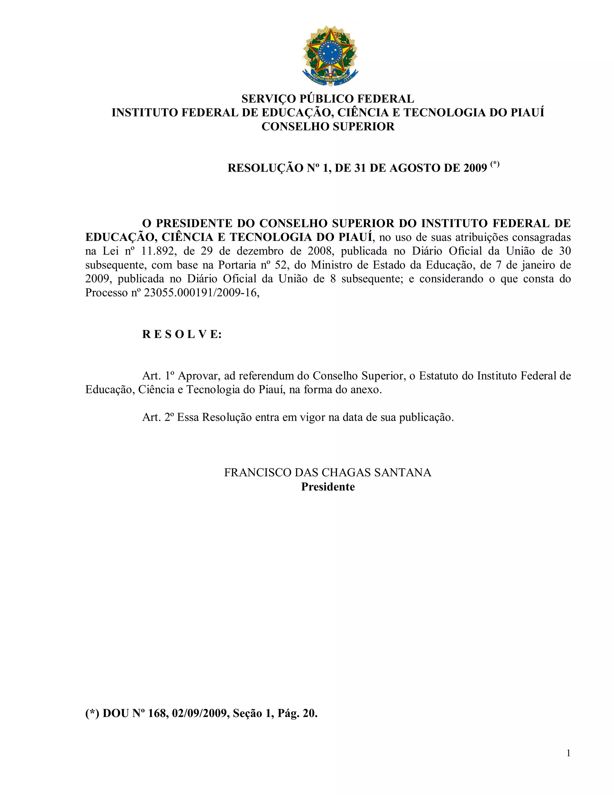 Este documento aprova o Estatuto do Instituto Federal de Educação, Ciência e Tecnologia do Piauí. O Estatuto define a natureza e finalidades da instituição, como fornecer educação profissional e tecnológica em todos os níveis, promover a integração entre educação básica e superior, e apoiar o desenvolvimento socioeconômico local e regional. O Estatuto também estabelece os princípios, objetivos e estrutura organizacional do Instituto.