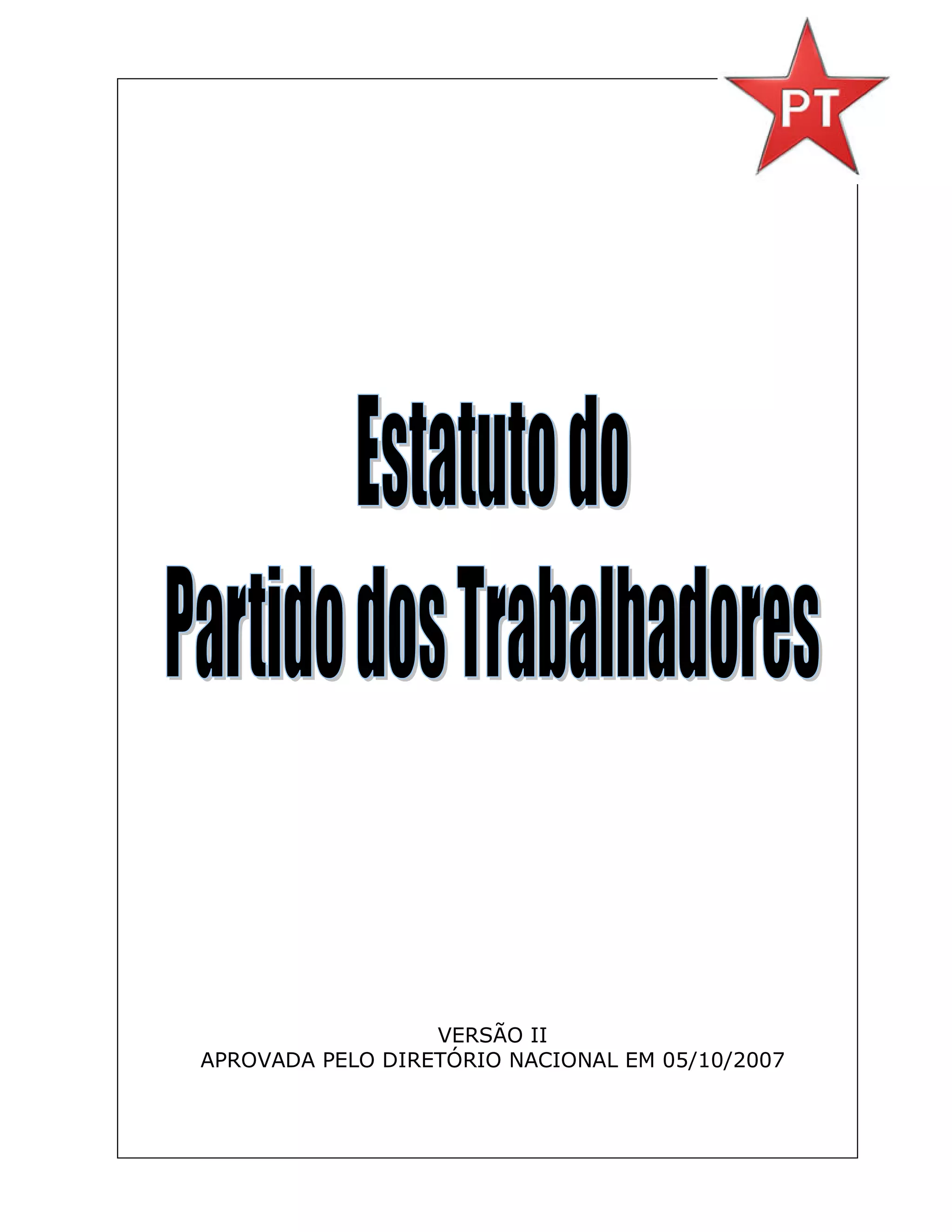 O documento é o estatuto do Partido dos Trabalhadores (PT), versão II, aprovado pelo diretório nacional em 05 de outubro de 2007. Ele estabelece a estrutura organizacional do partido, incluindo a duração, objetivos, filiação, direitos e deveres dos filiados, funcionamento interno, e normas para eleições e finanças. Também discute a formação política, comunicação e a disciplina partidária, visando garantir a participação democrática e a transparência nas atividades do partido.