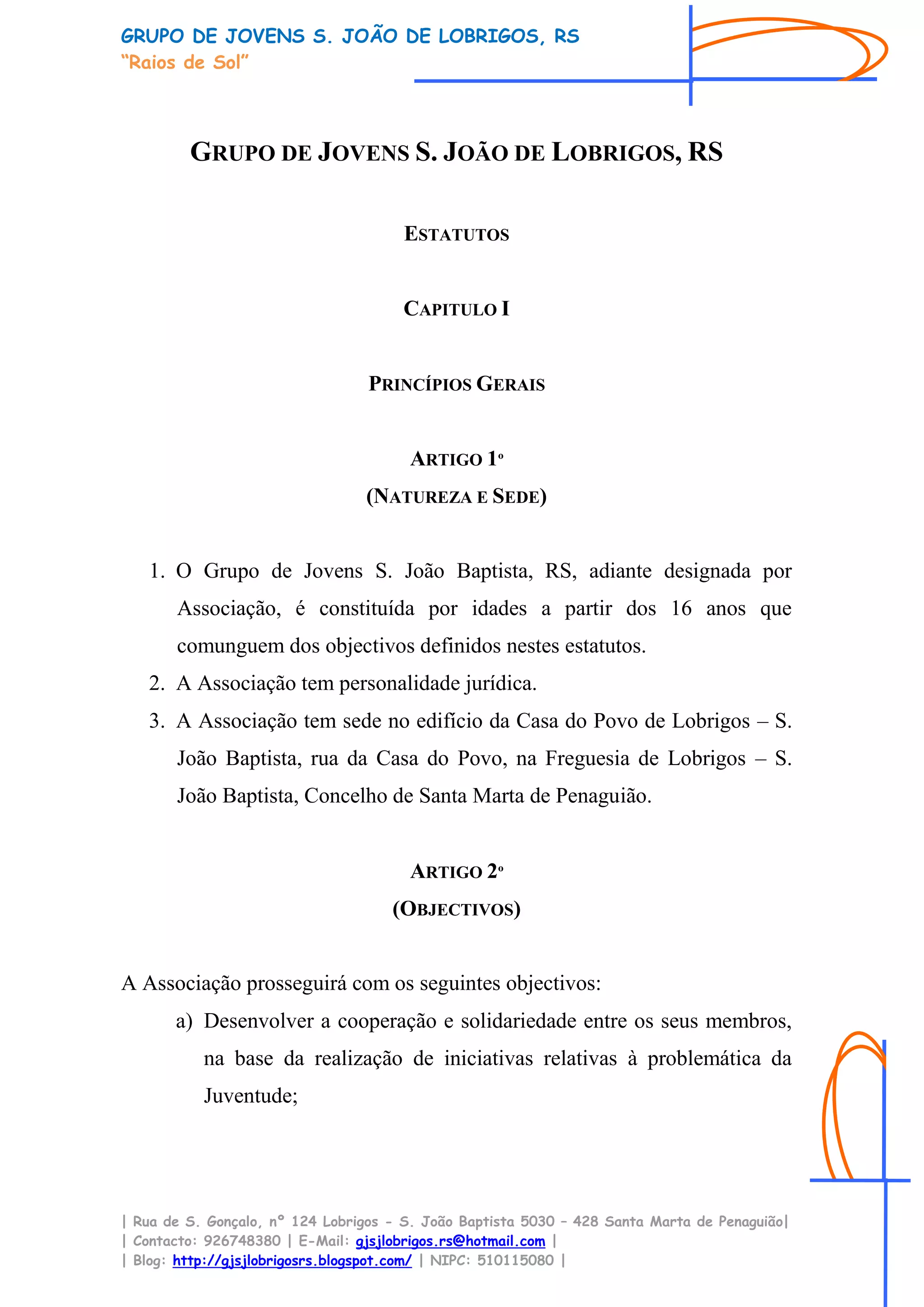 O documento descreve os estatutos de uma associação de jovens em Lobrigos, RS. Os estatutos definem os objetivos da associação como promover a cooperação entre os membros, cultura e religião local, e integração social dos jovens. Também descrevem a estrutura organizacional, incluindo a assembleia geral, diretoria e conselho fiscal como órgãos principais.