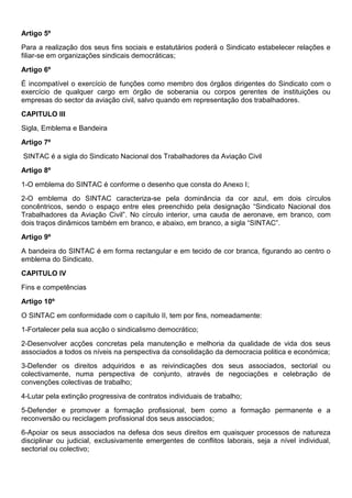 Este documento apresenta os estatutos do Sindicato Nacional dos Trabalhadores da Aviação Civil (SINTAC) em Portugal. Define a estrutura, objetivos e regras do sindicato, incluindo a filiação, direitos e deveres dos associados. Estabelece também os órgãos de governo do sindicato e os procedimentos disciplinares aplicáveis.