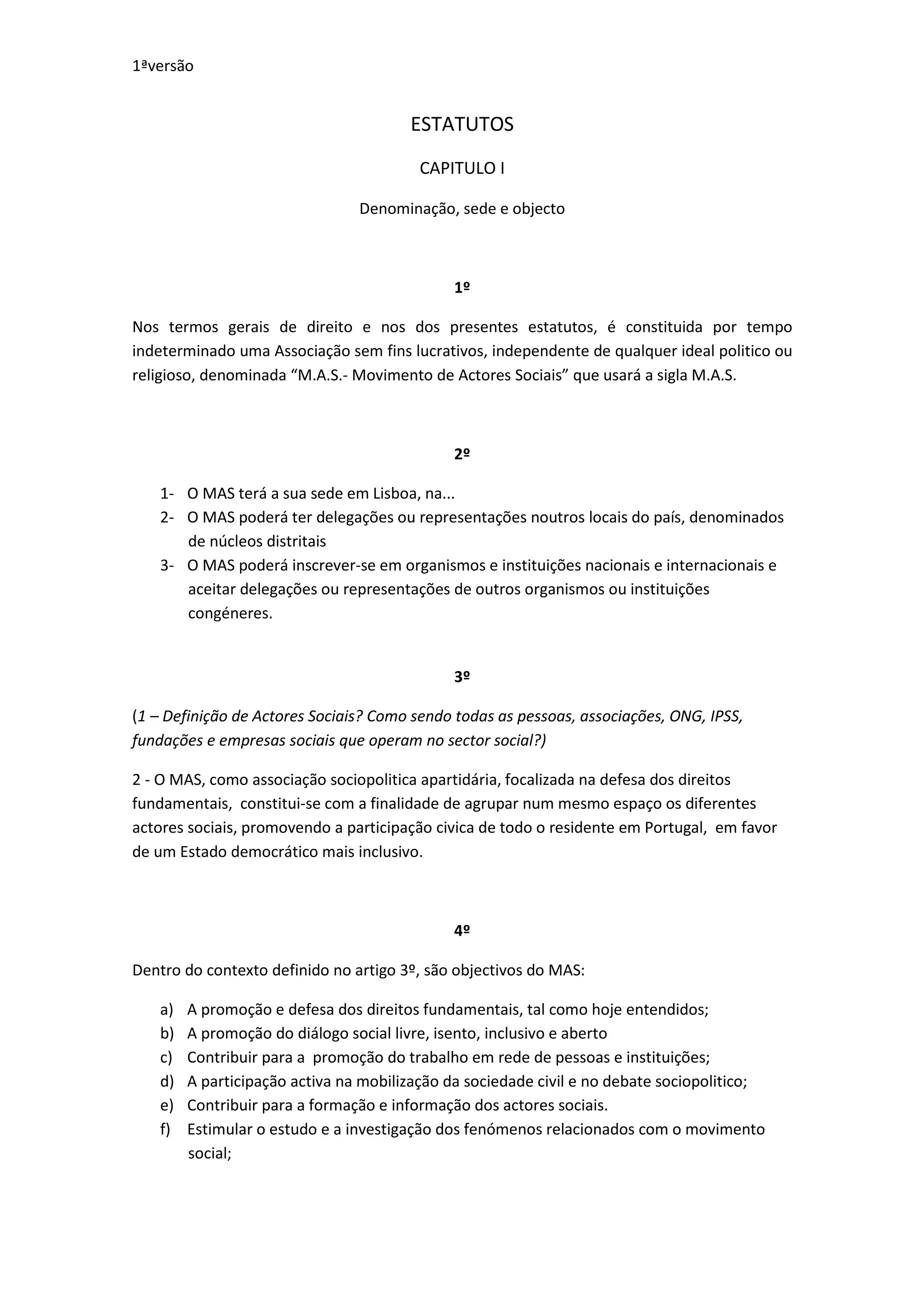 Este documento apresenta os estatutos de uma associação chamada Movimento de Actores Sociais (MAS). O MAS tem como objetivo agrupar diferentes atores sociais para promover a participação cívica em prol de um estado democrático mais inclusivo. Os estatutos definem a sede, os tipos de sócios, direitos e deveres dos sócios e os órgãos da associação.
