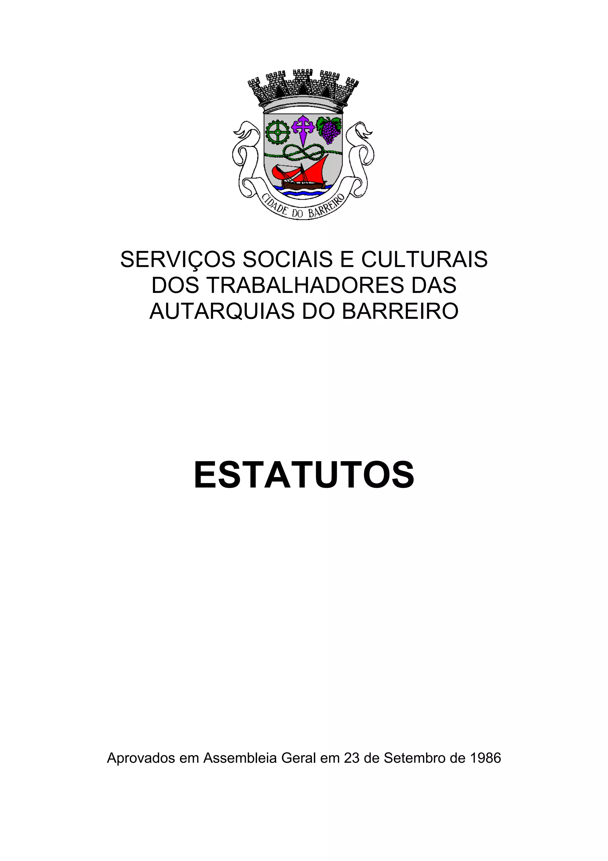 Este documento apresenta os estatutos de uma associação de trabalhadores de autarquias no Barreiro. Define os órgãos da associação e seus membros, direitos e deveres dos sócios, eleição dos corpos gerentes e suas responsabilidades.