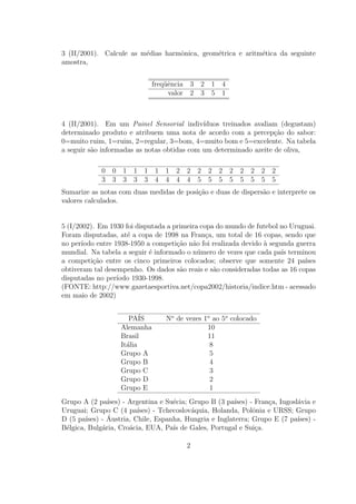 1) O documento apresenta 12 exercícios de estatística descritiva com dados reais sobre duração de chamadas telefônicas, notas de estudantes, desempenho de países em copas do mundo, e outros.
