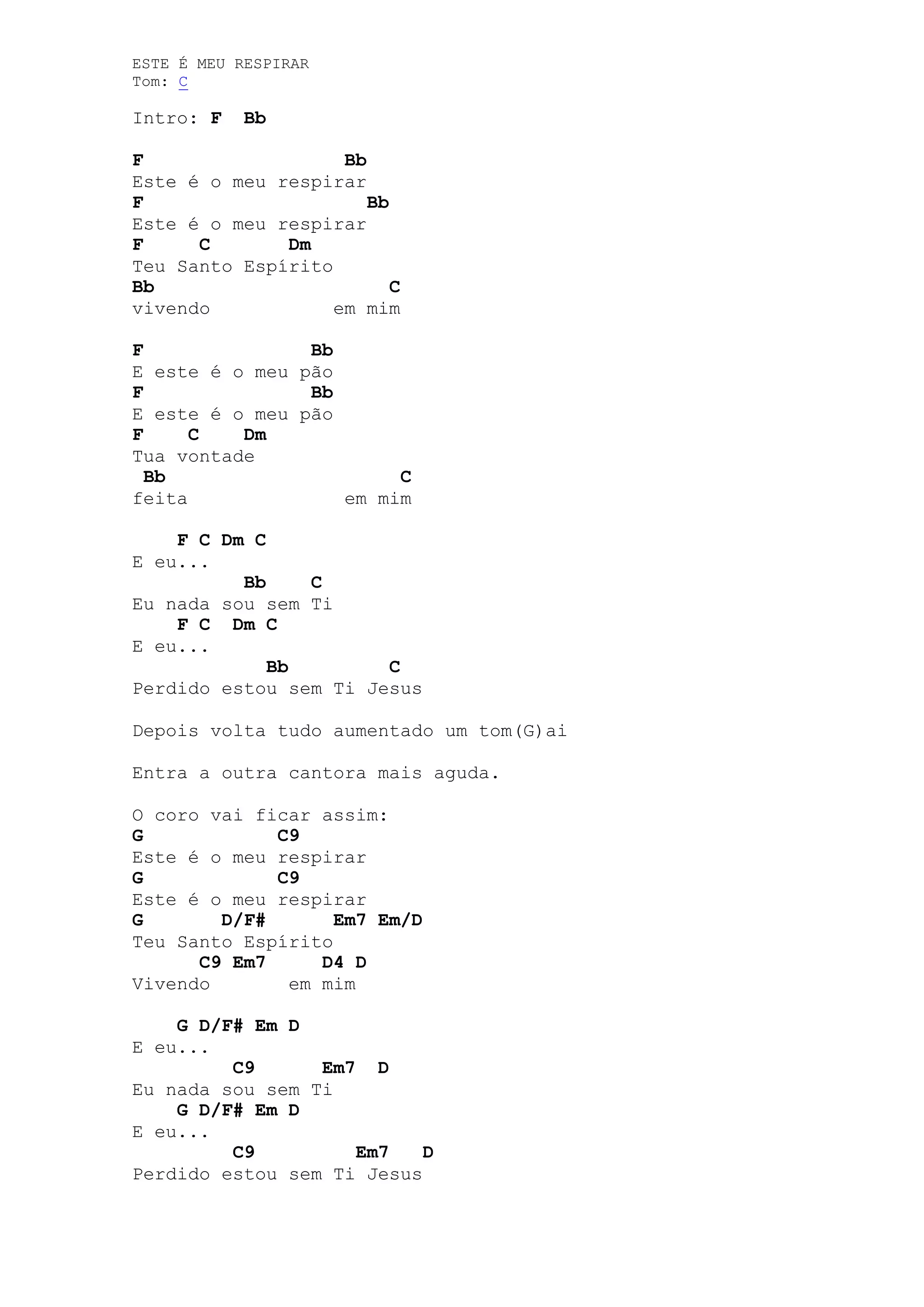 Este documento fornece as letras e acordes de uma música cristã em português. A música celebra o Espírito Santo vivendo dentro do cantor e a dependência total em Deus.