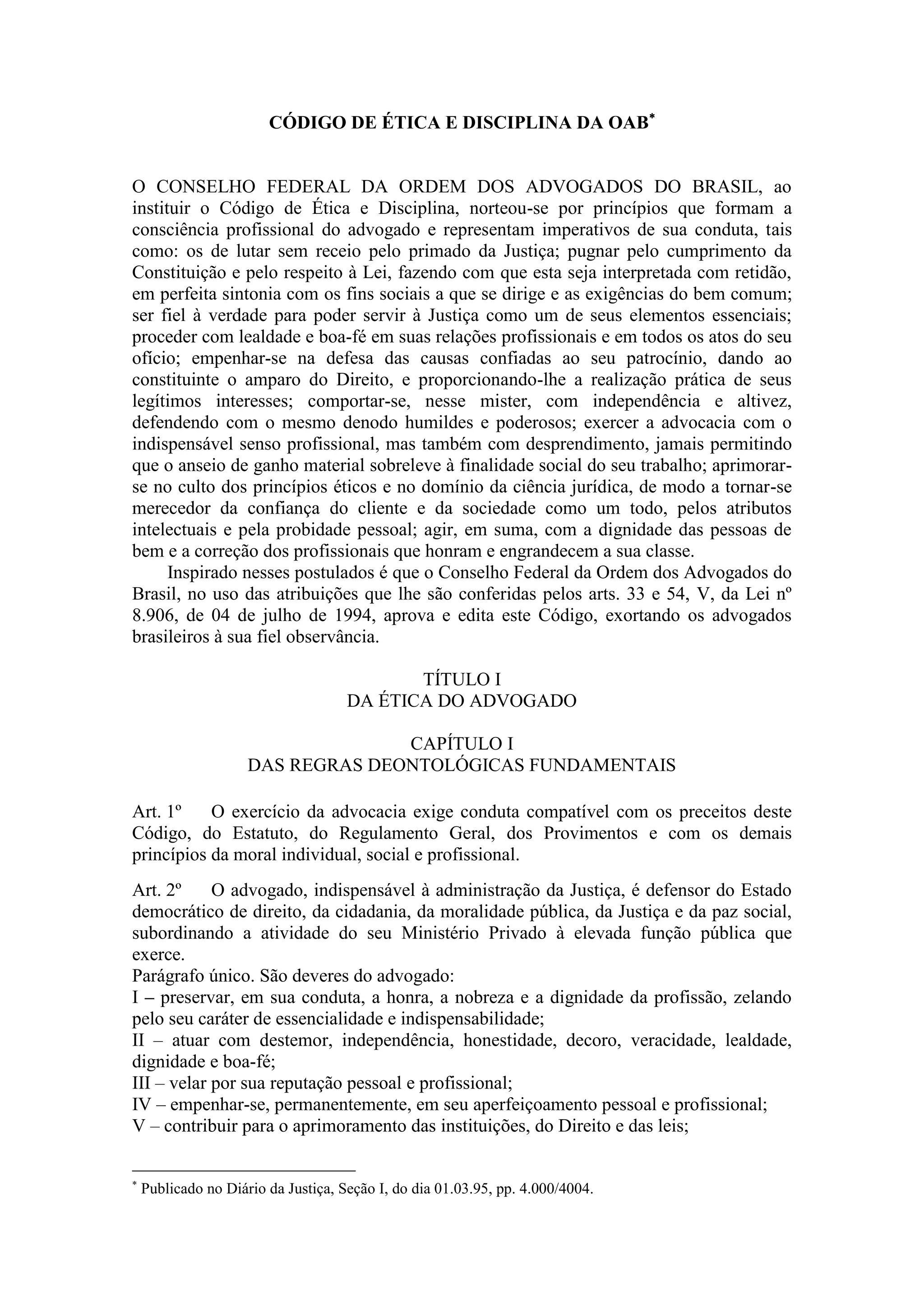 O documento estabelece o Código de Ética e Disciplina da OAB. Ele define os princípios éticos que norteiam a conduta dos advogados, como a defesa da justiça, da verdade e dos direitos dos clientes. Também estabelece regras sobre a relação com os clientes, o sigilo profissional e a publicidade da advocacia.