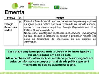 Este documento descreve as etapas e objetivos do Estágio Supervisionado II para estudantes de licenciatura em informática. Os estudantes continuarão observando aulas e auxiliando professores, além de planejar e implementar uma atividade prática na escola. O documento detalha os requisitos do estágio, cronograma, atividades, avaliação e informações gerais.