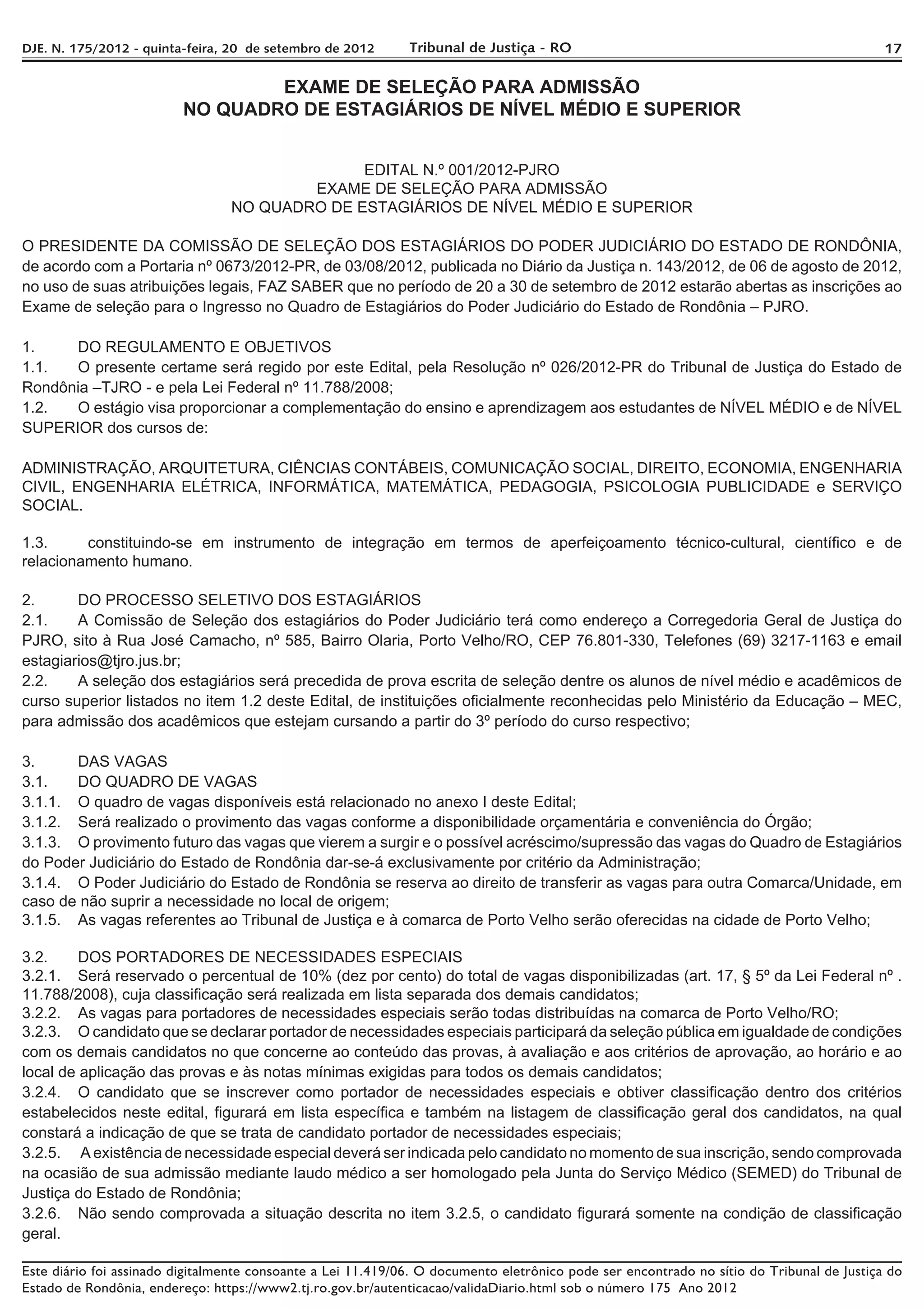 Este documento anuncia um processo seletivo para estagiários de nível médio e superior no Poder Judiciário de Rondônia. Ele define as regras para inscrição, realização de provas e seleção dos candidatos. O processo seletivo consistirá em uma prova escrita objetiva sobre língua portuguesa e informática para todos, e também sobre conteúdos específicos dos cursos para nível superior. O edital lista os cursos elegíveis e o número de vagas disponíveis.