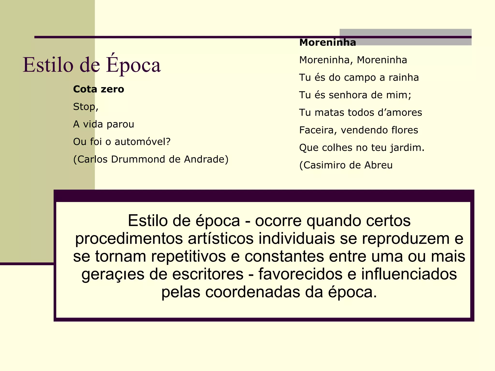 O documento descreve os principais períodos e autores da literatura portuguesa, desde a primeira época medieval até o modernismo do século XX. Apresenta os marcos da fundação da Arcádia Lusitana no século XVIII e a publicação de obras importantes como "Os Lusíadas" no Renascimento, além dos movimentos neoclassicismo, romantismo, realismo e modernismo.