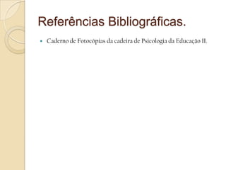 Este documento discute a dependência-independência de campo (DIC) na relação pedagógica e orientação escolar e profissional. Apresenta os objetivos de investigação sobre como os estilos cognitivos DIC afetam a aprendizagem, o ensino e a percepção dos professores. Conclui que alunos dependentes se beneficiam mais de interação social, enquanto alunos independentes se beneficiam mais de métodos de auto-descoberta.