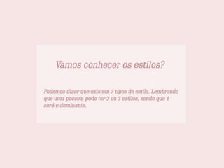 O documento descreve cinco estilos de moda e personalidade: 1) Tradicional/Clássico caracterizado por formalidade, maturidade e confiança; 2) Elegante caracterizado por sofisticação, poder e exigência; 3) Esportivo/Natural caracterizado por conforto, comunicação e despreocupação; 4) Moderno/Dramático caracterizado por modernidade, atitude e visão; 5) Romântico caracterizado por feminilidade, afetividade e delicadeza.