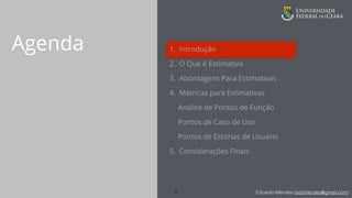 O documento discute estimativas de esforço para projetos de software e apresenta três abordagens: Análise de Pontos de Função, Pontos de Caso de Uso e métricas ágeis como Pontos de Estórias de Usuário. O autor também discute como calcular o esforço usando essas métricas e quais fatores influenciam as estimativas.