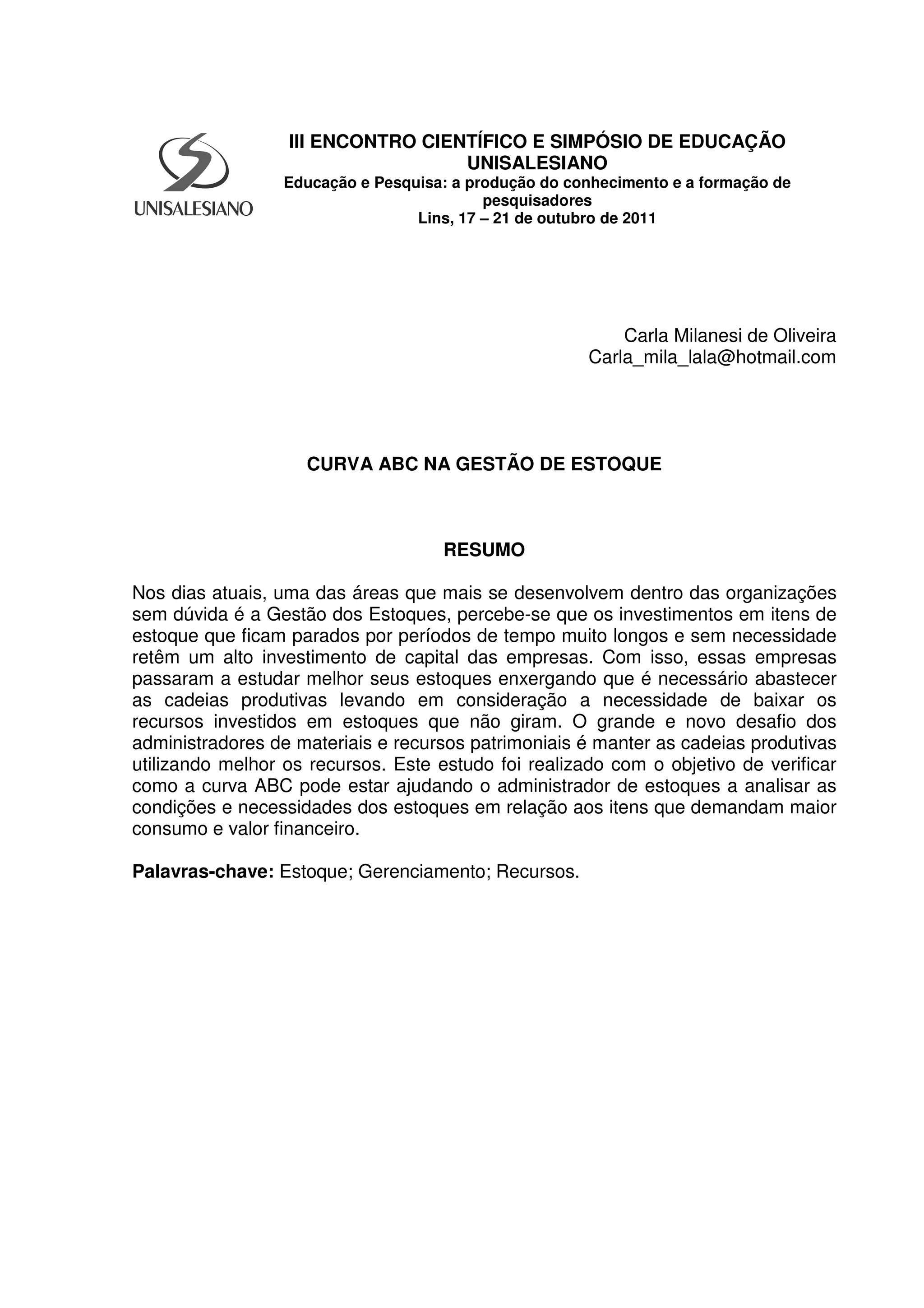 [1] O documento discute a curva ABC e sua importância na gestão de estoques. [2] A curva ABC ajuda os administradores a analisar as condições e necessidades dos estoques em relação aos itens que demandam maior consumo e valor financeiro. [3] Vários tipos de estoques são discutidos, incluindo estoques mínimos, de segurança, máximos e de antecipação.