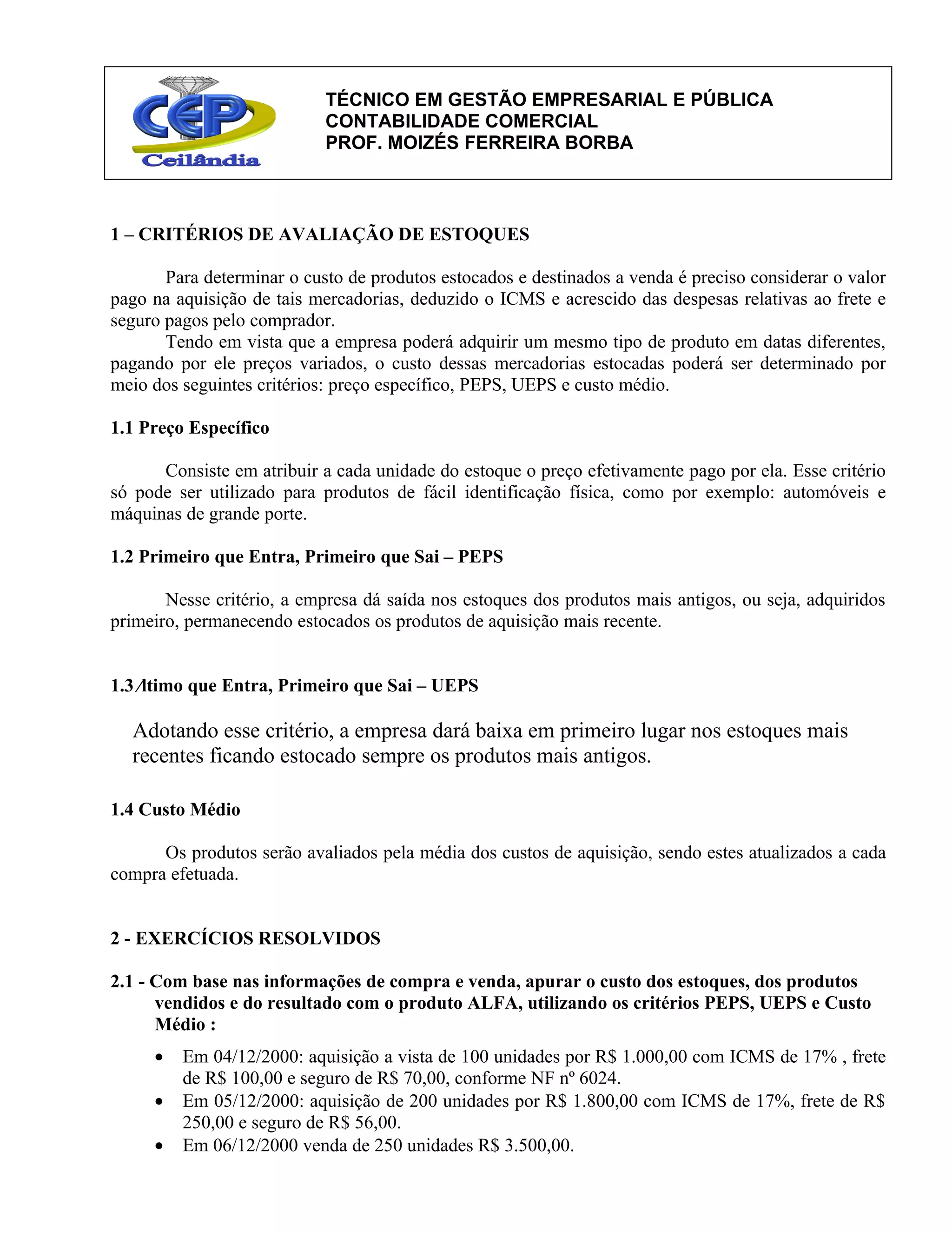 Este documento apresenta critérios para avaliação de estoques, incluindo preço específico, PEPS, UEPS e custo médio. Fornece um exemplo resolvido utilizando esses métodos para determinar o custo dos estoques, produtos vendidos e resultado de um produto. Também propõe um exercício para ser resolvido aplicando esses mesmos métodos.
