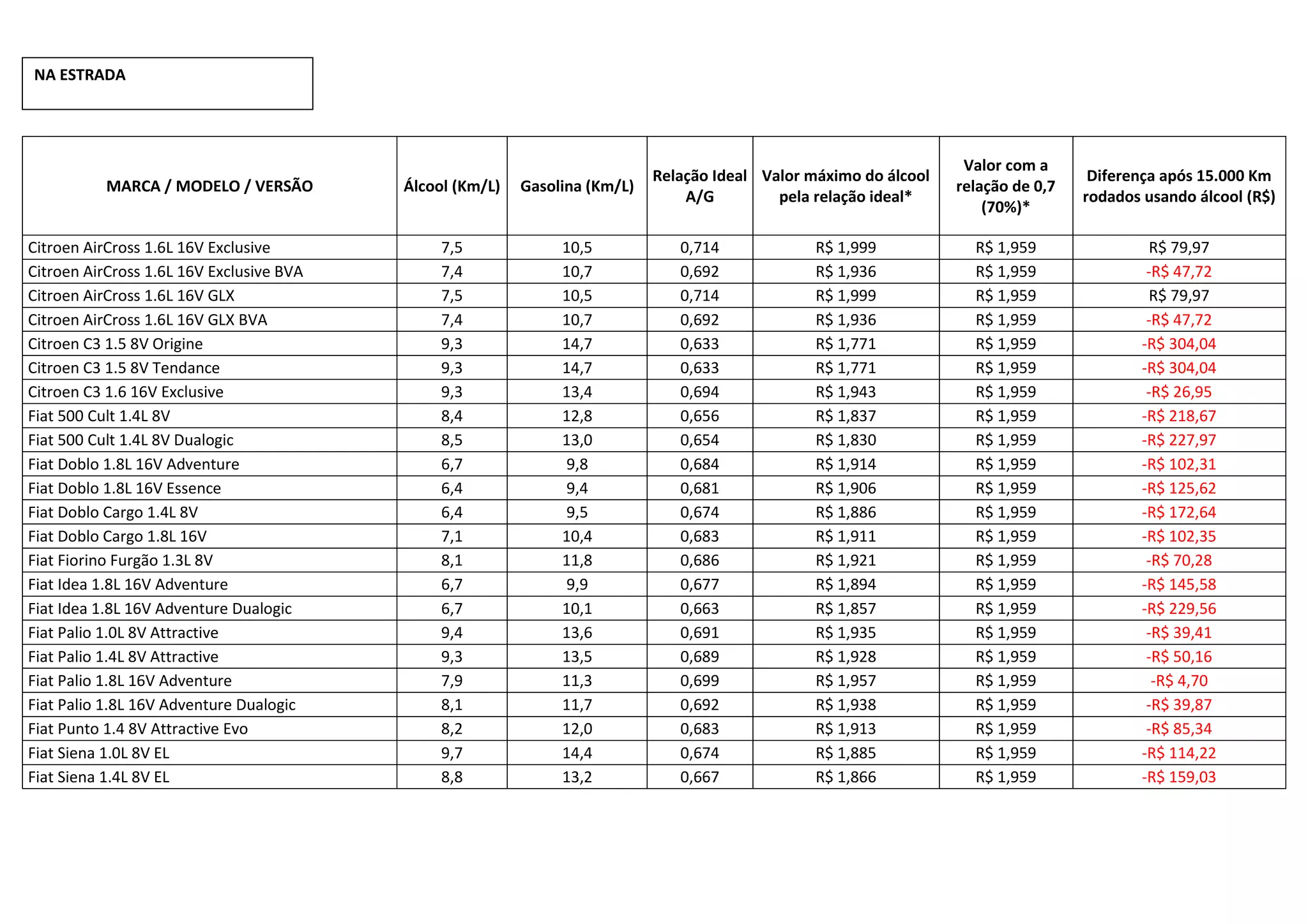 A tabela compara o consumo de álcool e gasolina de diversos modelos de veículos. Fornece a relação ideal de álcool/gasolina, o valor máximo que o álcool pode custar com base nessa relação e a diferença financeira após rodar 15.000km usando álcool. Muitos modelos apresentam economia ao usar álcool, porém alguns teriam prejuízo.