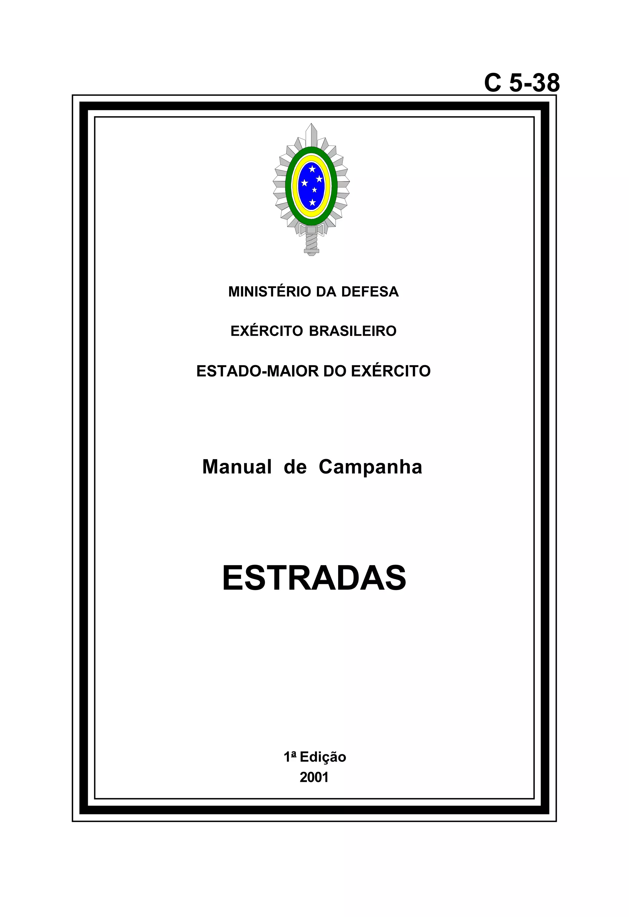 Este documento apresenta o manual de campanha C5-38 sobre estradas do Exército Brasileiro. O manual fornece informações sobre conceitos gerais de estradas, conservação, reparação e melhoramento, construção, drenagem, terraplanagem, cortes, aterros e trafegabilidade. O índice detalha os nove capítulos e seus respectivos artigos tratados no manual.