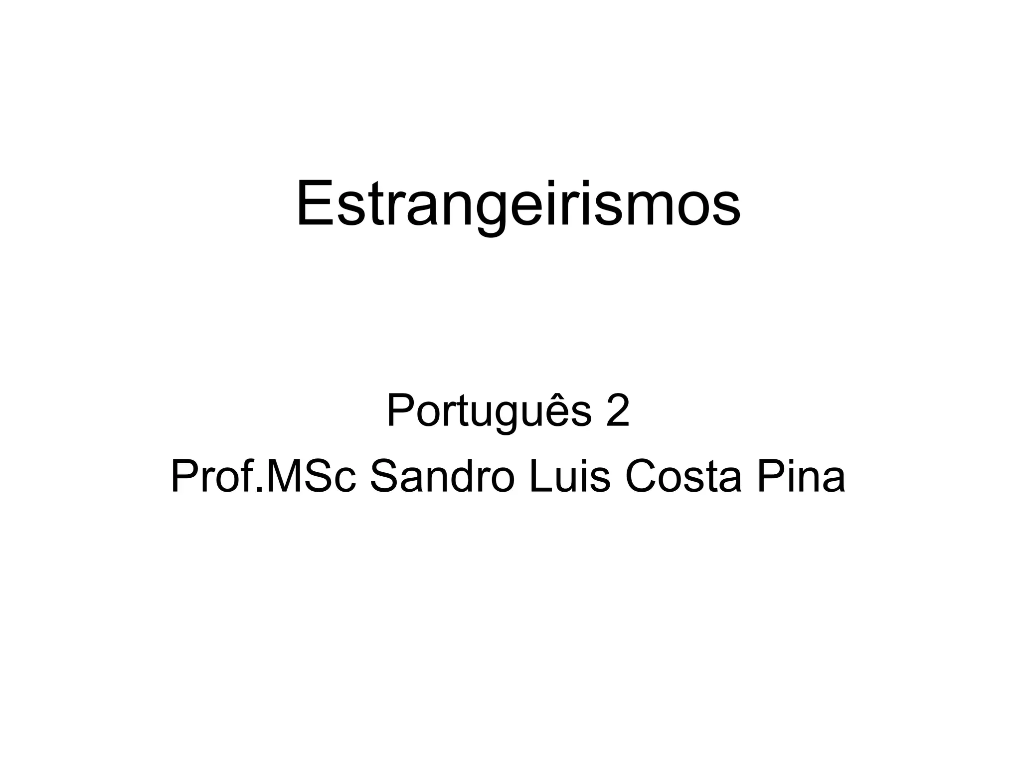O documento discute estrangeirismos na língua portuguesa. Apresenta duas categorias de estrangeirismos: com aportuguesamento e sem aportuguesamento. Também discute os principais tipos de estrangeirismos como latinismos, anglicismos e galicismos e fornece exemplos de cada um.