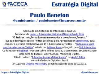 Paulo Beneton apresenta uma estratégia digital para a FACECA que inclui estar presente nas mídias sociais gerando relacionamento com alunos e compartilhando conteúdo em blogs corporativos. Atualmente a FACECA não tem presença oficial nas mídias sociais, com apenas algumas páginas não oficiais e poucos seguidores.