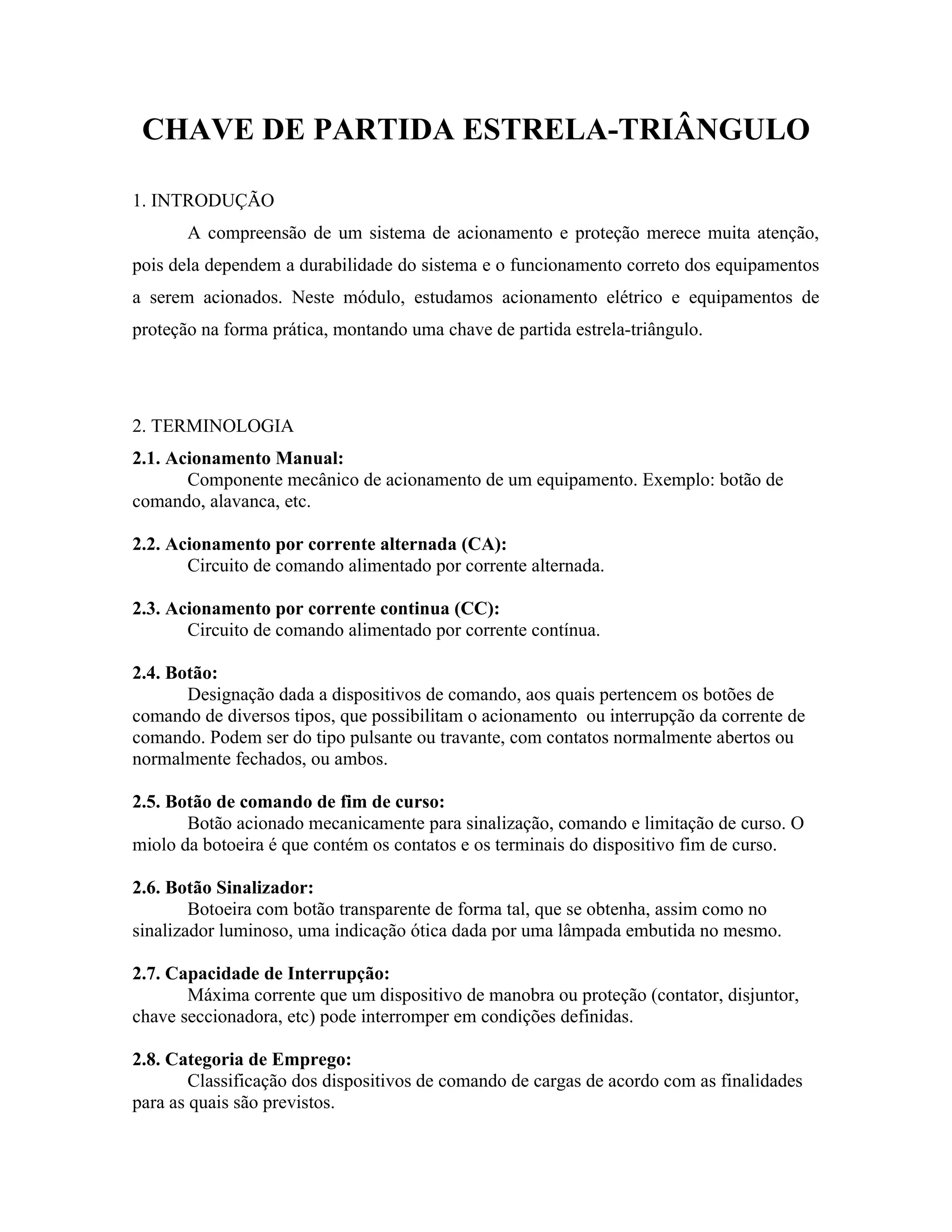 O documento descreve os componentes e funcionamento de uma chave de partida estrela-triângulo, incluindo definições de termos como contator, relé e fusível. Explica que a chave conecta o motor inicialmente em estrela para reduzir a corrente de partida, depois altera para triângulo quando o motor atinge velocidade nominal.