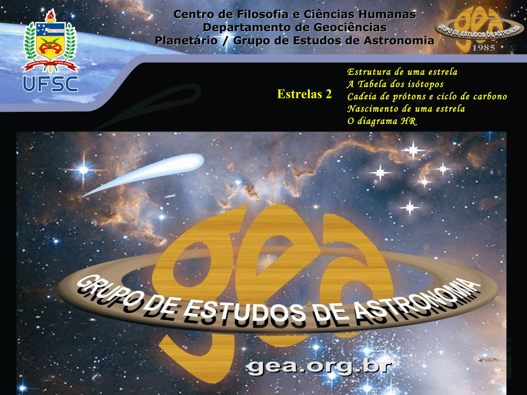 1) O documento discute a estrutura e vida das estrelas, incluindo sua formação, composição e processos internos como fusão nuclear.