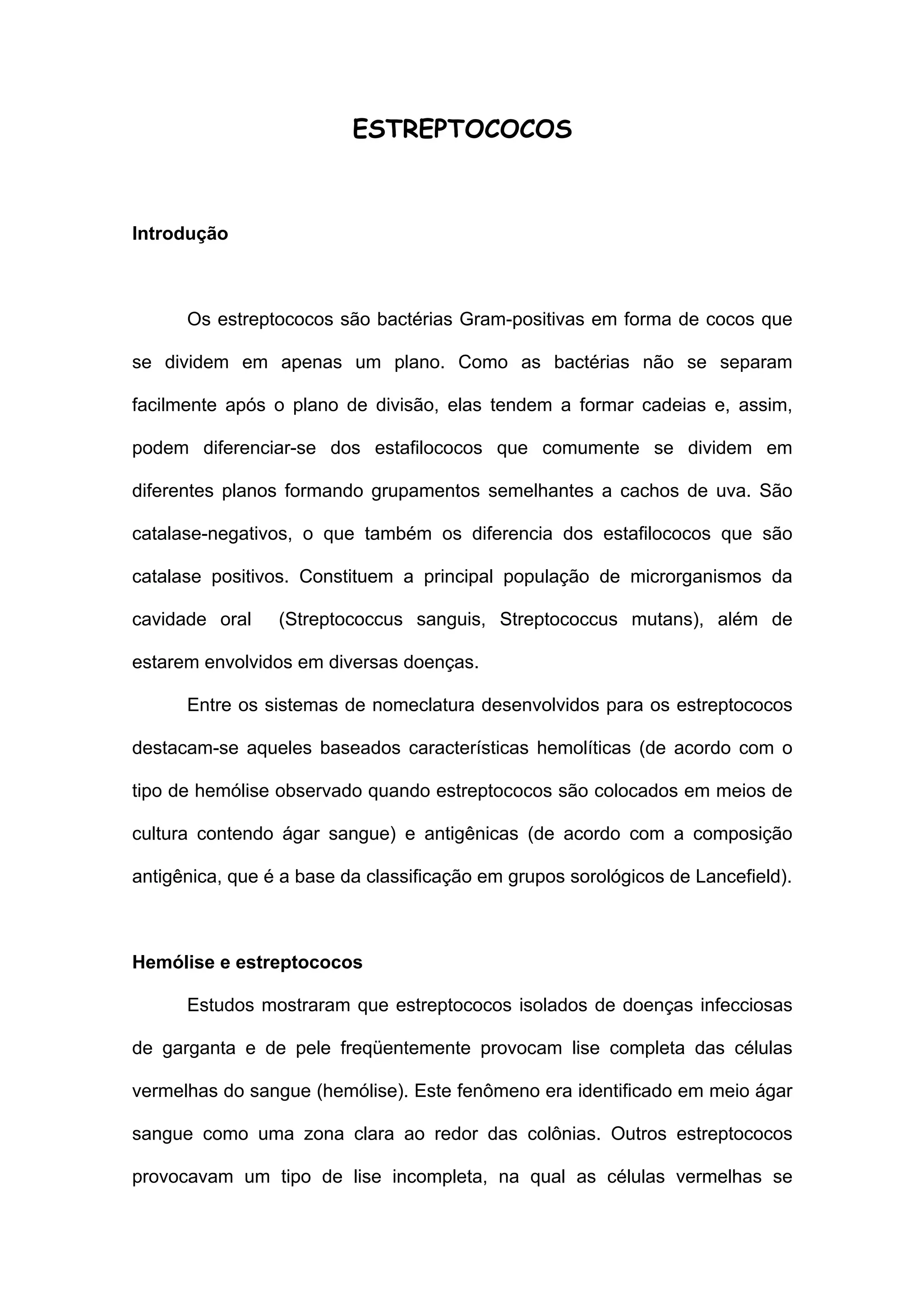 Este documento fornece um resumo sobre estreptococos. Estreptococos são bactérias Gram-positivas que se dividem em apenas um plano e formam cadeias. Eles são classificados de acordo com seu tipo de hemólise e grupo sorológico de Lancefield. Estreptococos piogênicos como o Streptococcus pyogenes causam infecções como faringite e impetigo, enquanto Streptococcus pneumoniae causa infecções como pneumonia e meningite.