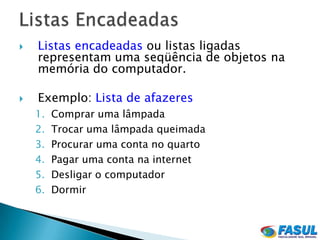 O documento descreve as listas encadeadas e como representá-las em C. As listas encadeadas representam uma sequência de objetos na memória ligados por ponteiros. Cada elemento da lista contém um campo de dados e um ponteiro para o próximo elemento, permitindo acesso flexível aos itens.