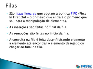 O documento descreve o funcionamento de filas, listas lineares que adotam a política FIFO. As filas permitem inserções no final e remoções no início. Elas podem ser implementadas usando vetores de forma circular, incrementando os índices de modo a "andar" no vetor.