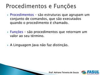 1) Funções são blocos de código que retornam um valor ao serem chamados, enquanto procedimentos executam ações mas não retornam valores. 2) Funções e procedimentos organizam e reutilizam código, evitando repetições. 3) O documento fornece exemplos de como declarar e usar funções e procedimentos em Java.