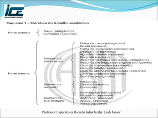 1. O documento descreve a estrutura padrão para trabalhos acadêmicos do ICE, dividida em três partes: pré-textual, textual e pós-textual.
