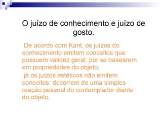 O documento discute o primeiro paradoxo de Kant sobre beleza. De acordo com Kant, o juízo estético é ambíguo pois compartilha características com o juízo sobre o agradável e o juízo de conhecimento, mas também difere deles. Kant afirma que "o juízo estético não tem outro fundamento se não a forma da finalidade de um objeto" e que "a satisfação determinada pelo juízo de gosto é uma finalidade sem fim".