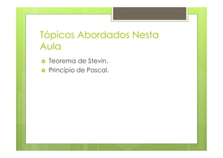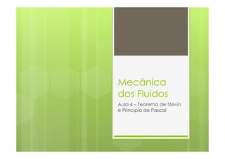 O documento discute os principais tópicos da aula 4 de Mecânica dos Fluidos: