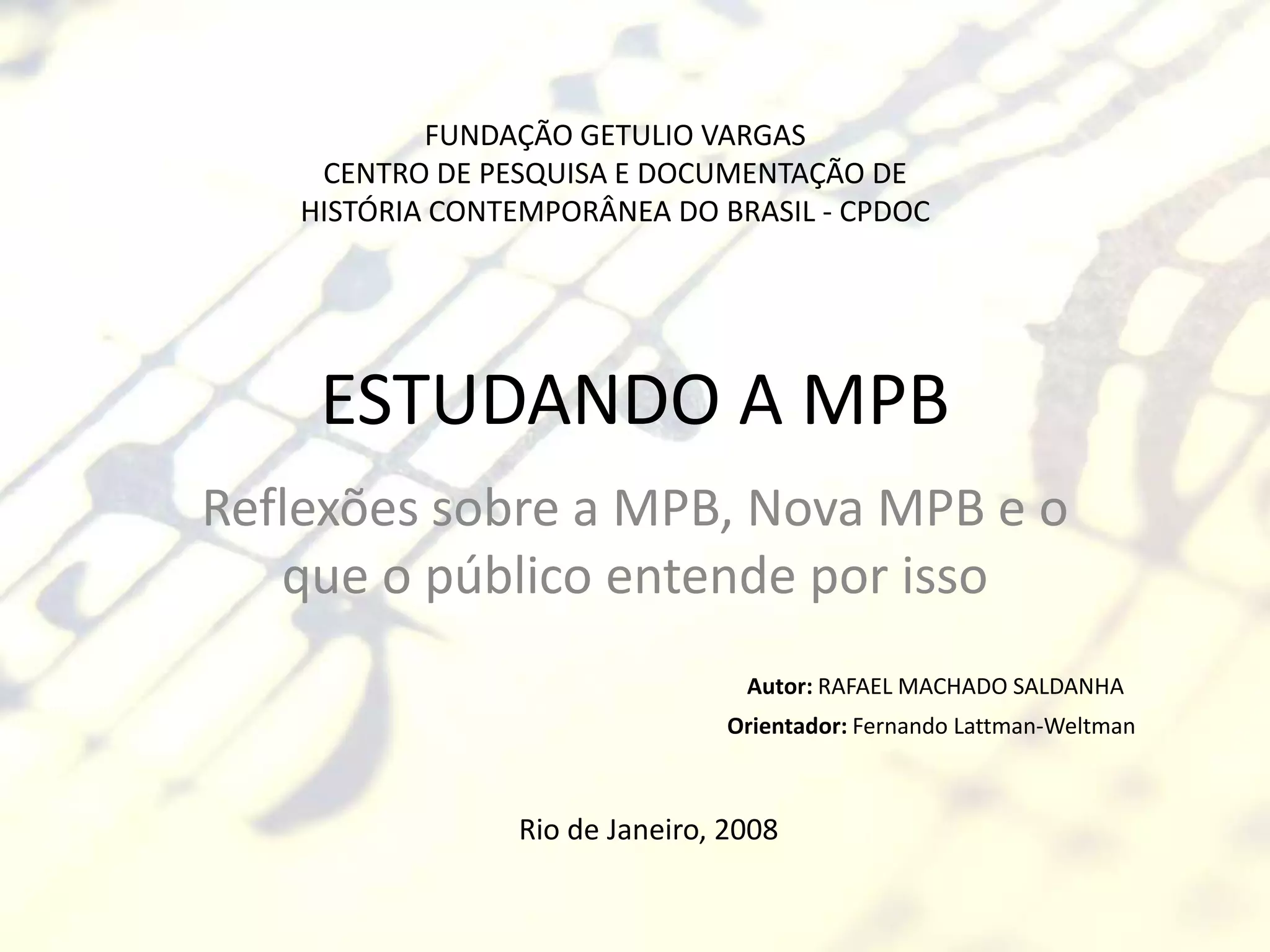 - O documento discute o processo de modificação do significado da sigla MPB ao longo do tempo, desde sua origem como música politicamente engajada até sua atual aceitação de influências estrangeiras.