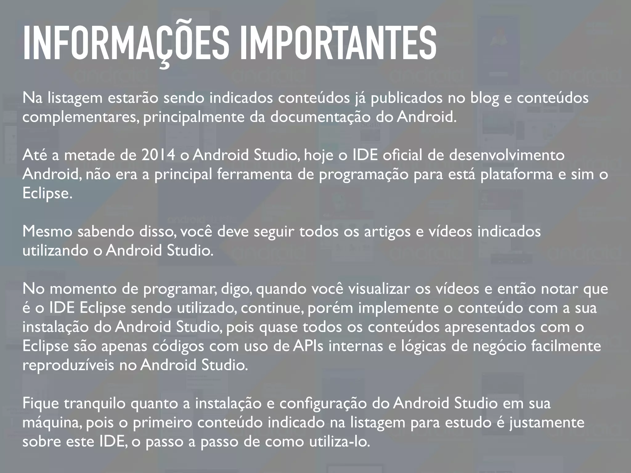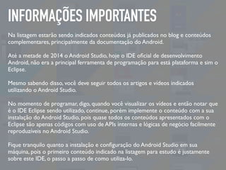 Este documento fornece uma lista de conteúdos recomendados para estudar o desenvolvimento Android, incluindo IDEs, layouts, persistência de dados, recursos de rede e mais. O modo recomendado de estudo é baixar os projetos de exemplo e segui-los no Android Studio à medida que o leitor aprende cada novo tópico.