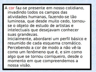As cores primárias são vermelho, azul e amarelo, que não podem ser misturadas com outras cores. Cores secundárias como roxo, verde e laranja são formadas pela mistura de duas cores primárias.