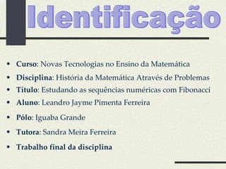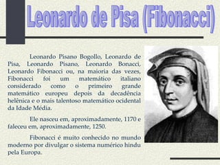 O documento descreve a vida e obra do matemático italiano Leonardo Fibonacci, conhecido por introduzir o sistema numérico hindu-arábico na Europa. Apresenta o problema clássico dos coelhos de Fibonacci, que gerou a famosa sequência numérica de Fibonacci. Explica como a sequência é formada segundo a lei de recorrência.