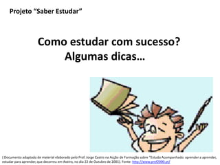 Este documento fornece dicas para estudar com sucesso, incluindo estar atento nas aulas, tirar notas, revisar regularmente, gerir o tempo de estudo de forma equilibrada, e abordar testes com confiança.