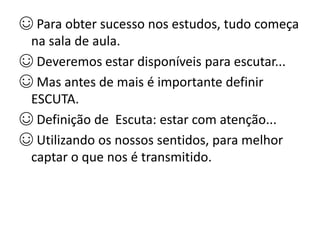 ☺ Definição de Escuta: estar com atenção...