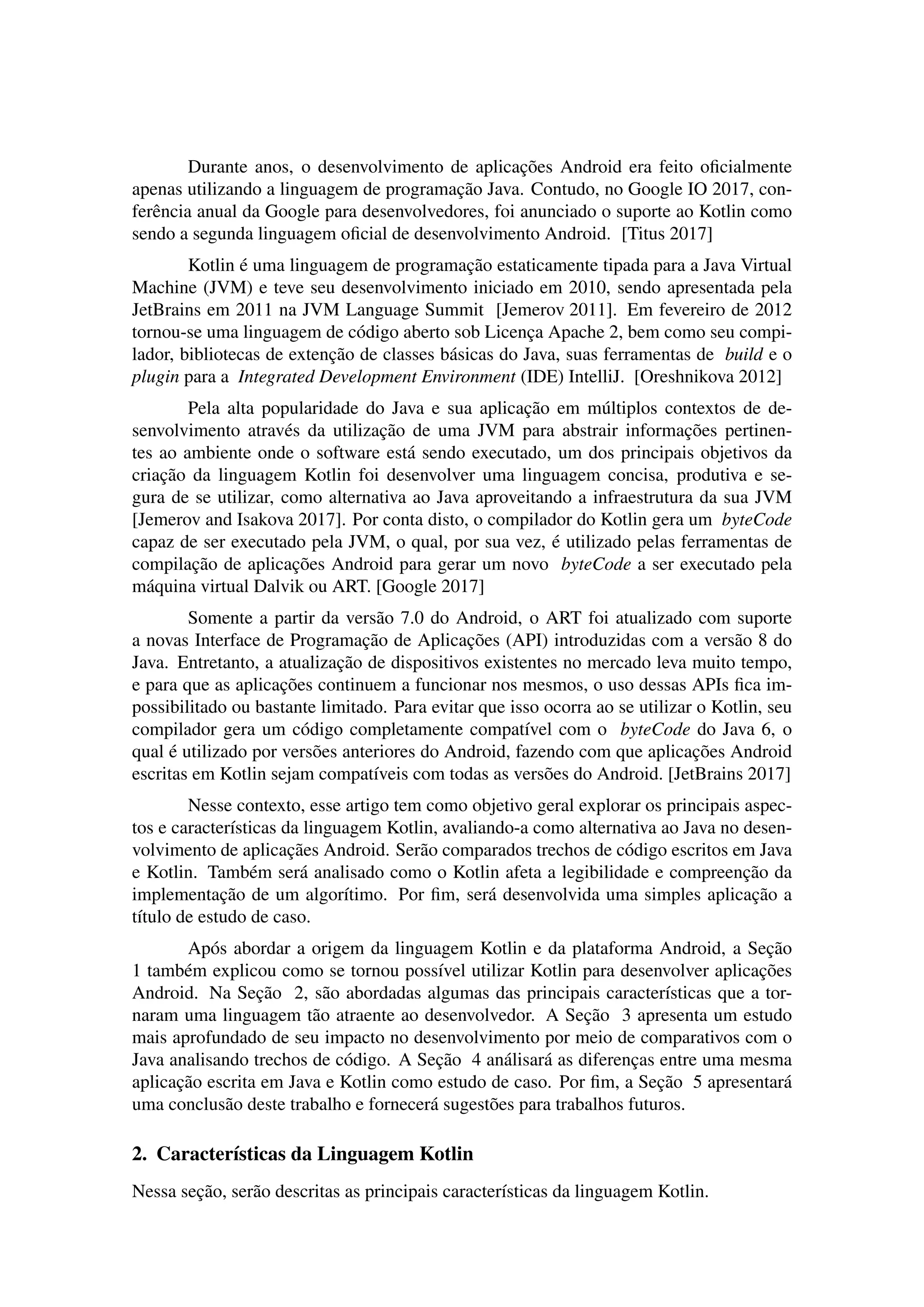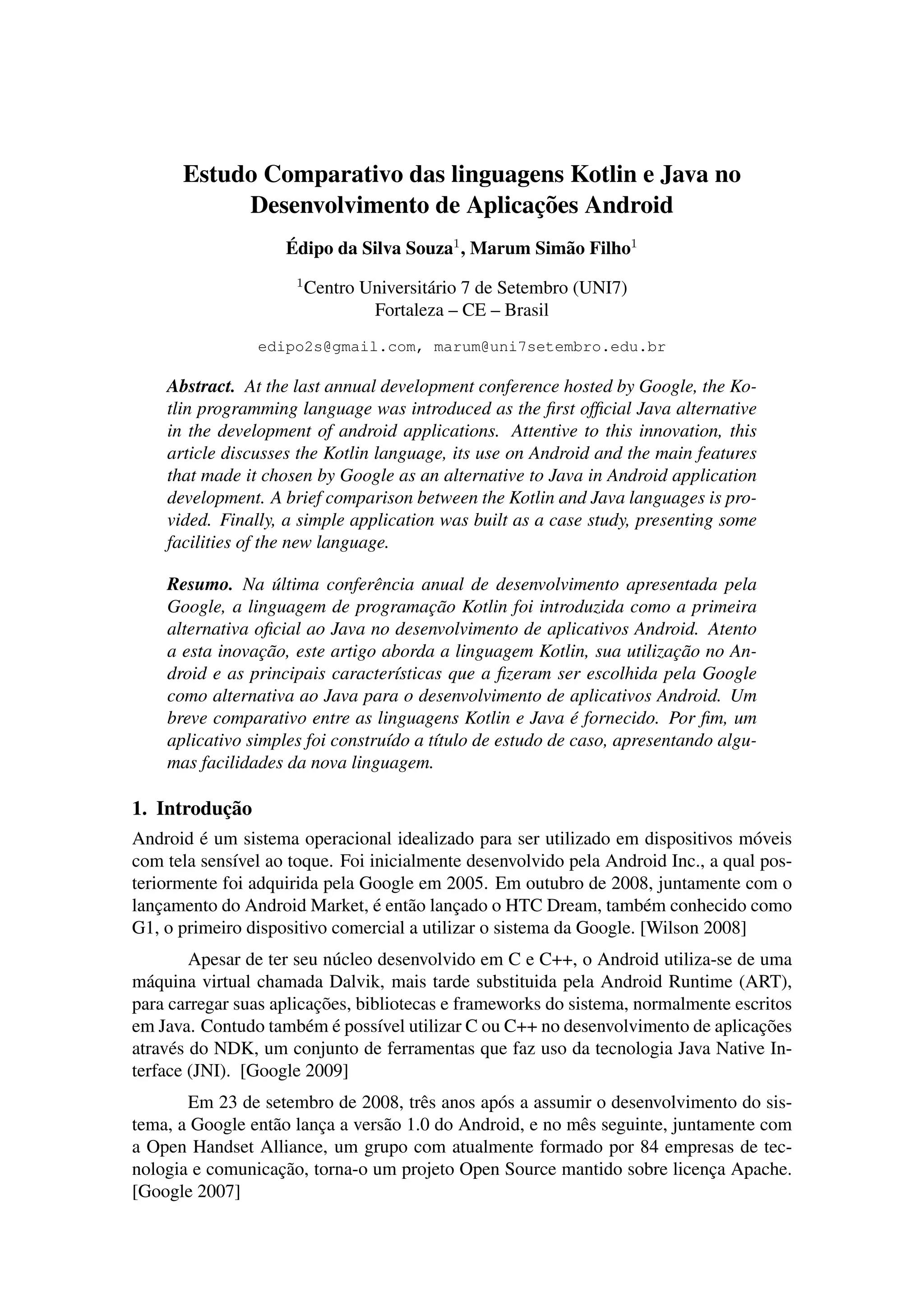 O documento apresenta um estudo sobre a linguagem de programação Kotlin como alternativa ao Java no desenvolvimento de aplicações Android, enfatizando suas principais características e vantagens. Ele destaca a interoperabilidade entre Kotlin e Java, elementos de sintaxe que facilitam o desenvolvimento, e uma análise comparativa por meio de trechos de código. Além disso, um aplicativo simples é desenvolvido como estudo de caso para exemplificar as facilidades proporcionadas pela nova linguagem.