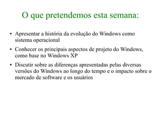 O documento apresenta a história e principais características do sistema operacional Windows, desde as suas primeiras versões até o Windows 7. Aborda a evolução do Windows ao longo do tempo, desde sua origem no MS-DOS até se tornar um sistema operacional completo e independente, e discute os principais componentes e arquitetura do Windows XP.