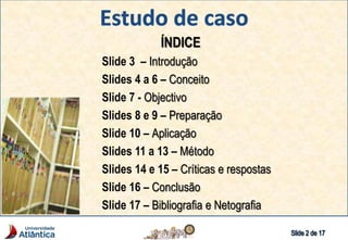 Este documento apresenta as etapas de preparação e aplicação de um estudo de caso, incluindo sua definição, objetivos, métodos, críticas e conclusões. Ele discute como os estudos de caso exploram intensamente as características de um assunto para entendê-lo e melhorá-lo.