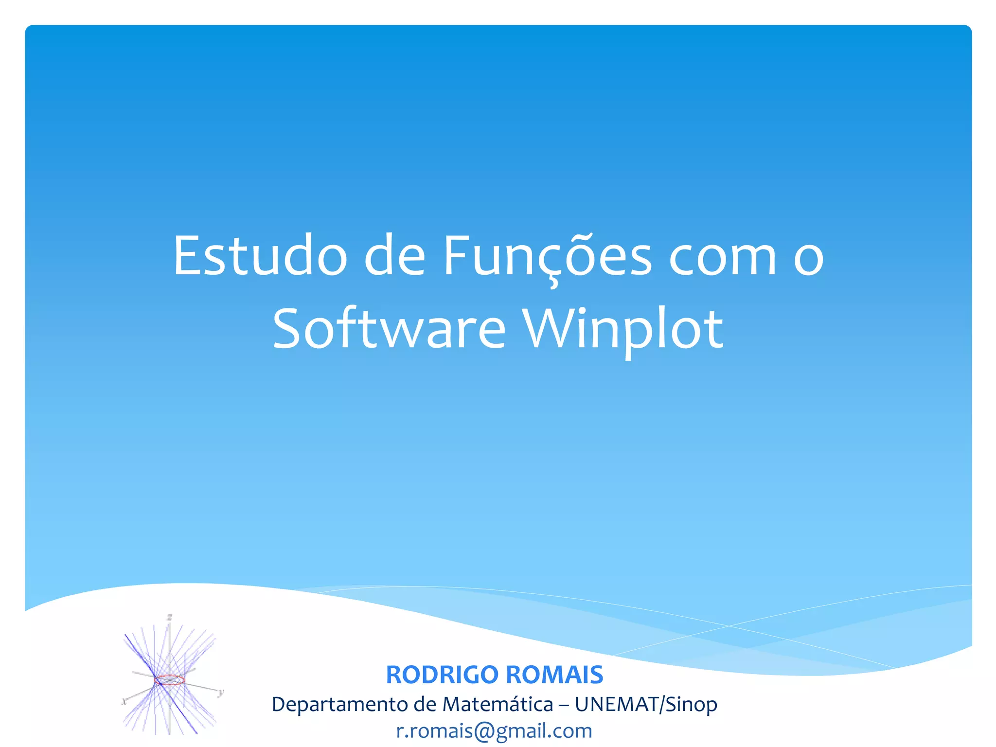O documento discute o software Winplot, que permite plotar gráficos de funções matemáticas. Apresenta brevemente a história do software, suas características, comandos básicos e como pode ser útil no ensino de funções para estudantes de graduação. Uma ferramenta alternativa é o Wolfram Alpha, que tem funcionalidades semelhantes.