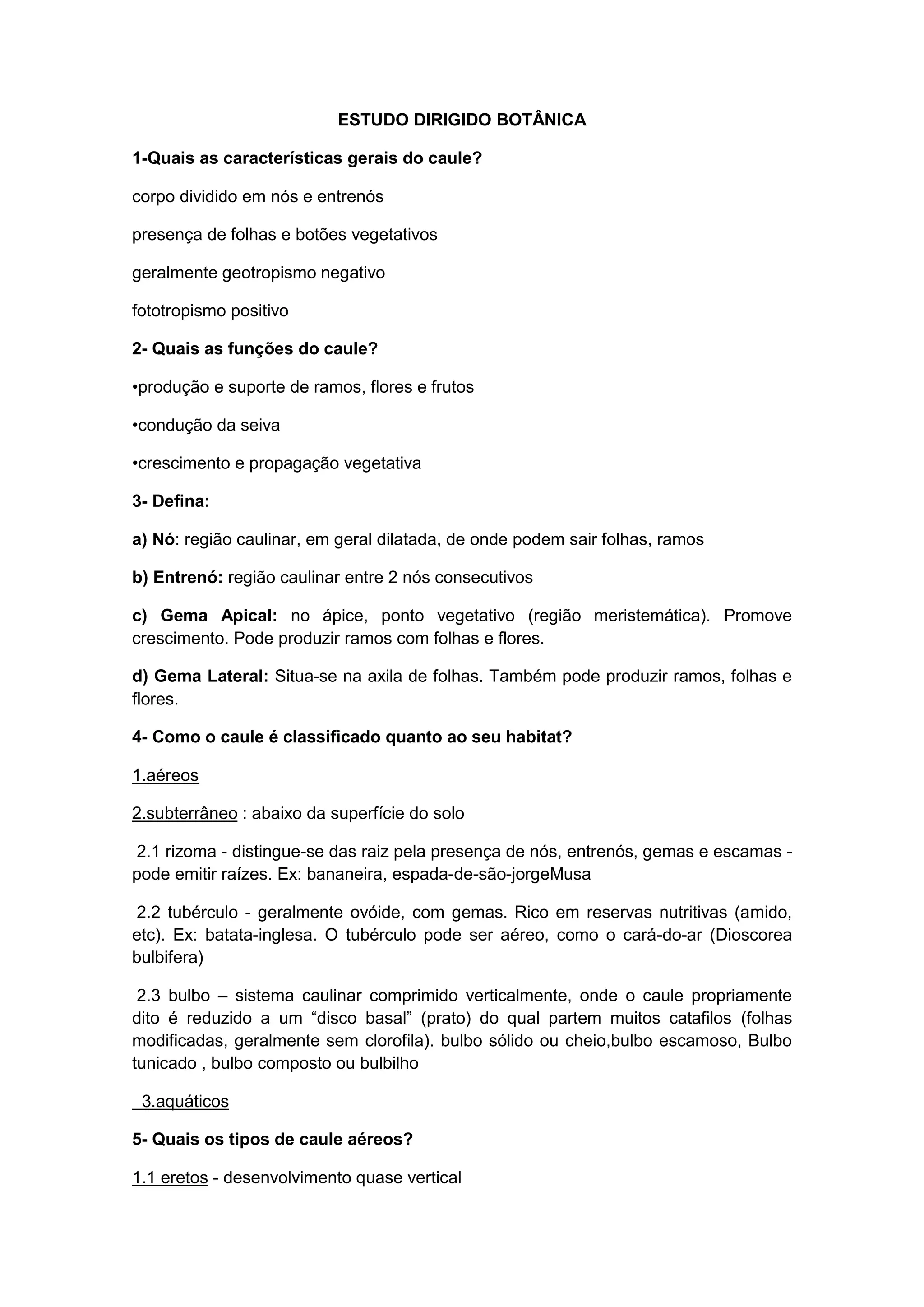 O documento descreve as características e classificações de diferentes partes da planta, incluindo caule, raiz, flor e fruto. O caule pode ser aéreo, subterrâneo ou aquático e é classificado de acordo com sua estrutura e habitat. As flores são classificadas de acordo com seu sexo e estrutura. Os frutos são classificados de acordo com sua deiscência.