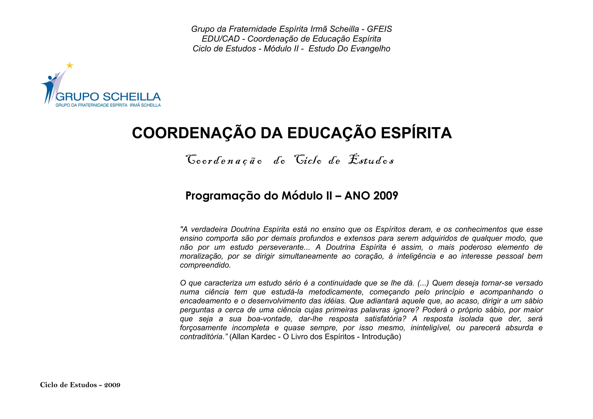 O documento apresenta o ciclo de estudos do Grupo da Fraternidade Espírita Irmã Scheilla, focando na educação espírita e no estudo do Evangelho sob a luz da doutrina espírita. Os módulos abrangem temas como o cristianismo, a missão de Jesus, os apóstolos, a reencarnação e questões morais, sempre enfatizando a importância de um estudo metódico e contínuo. A proposta é integrar os participantes, promover reflexões sobre os ensinamentos de Jesus e suas implicações para a evolução espiritual.