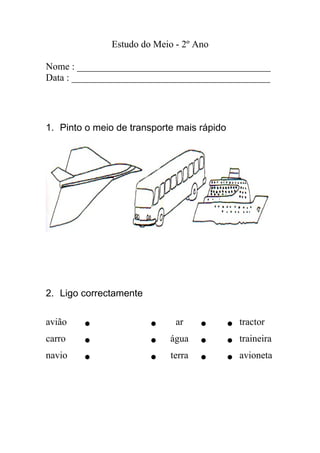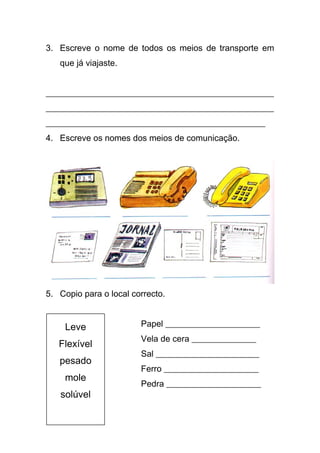 Este documento é um teste de Estudo do Meio para alunos do 2o ano. Ele inclui questões sobre meios de transporte, meios de comunicação, e objetos com base em suas propriedades físicas.