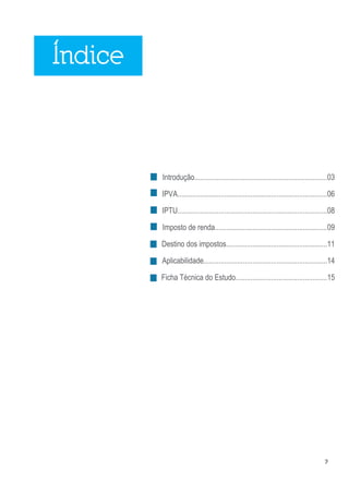 O documento analisa a percepção dos brasileiros sobre os impostos, com foco no IPVA, IPTU e Imposto de Renda, mostrando que a insatisfação é predominante nas redes sociais. A pesquisa revelou que as interações sobre impostos são frequentemente negativas e de humor irônico, refletindo a dificuldade financeira enfrentada pelos cidadãos. Além disso, destaca-se a arrecadação significativa de impostos no Brasil, que gera dúvidas sobre seu uso e a necessidade de uma reforma tributária para melhorar a gestão desses recursos.