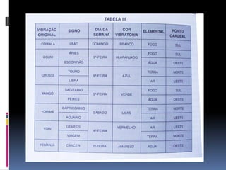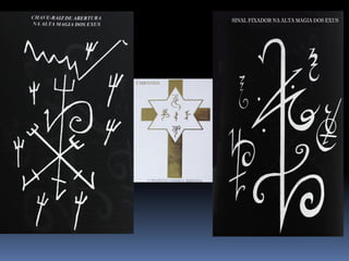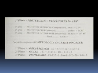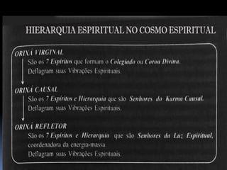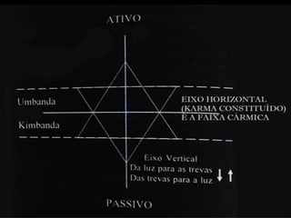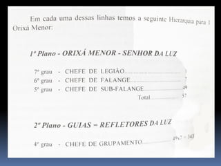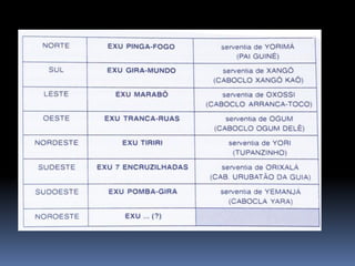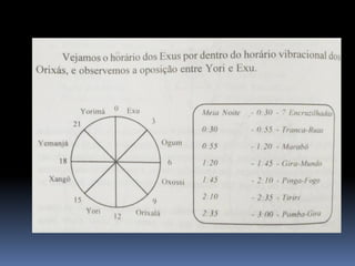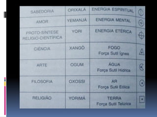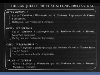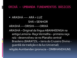 O documento fornece informações fundamentais sobre a Umbanda, incluindo os principais conceitos de Orixás, Exus e a hierarquia espiritual. Resume os papéis dos Exus como guardiões das leis divinas e executores do karma. Também descreve brevemente os atributos dos principais Orixás.