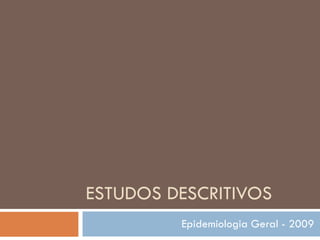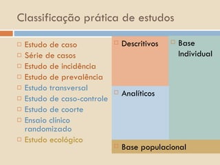 Este documento descreve diferentes tipos de estudos epidemiológicos, incluindo estudos descritivos como estudos de caso e séries de casos, e estudos analíticos como estudos transversais e longitudinais. Estudos de caso envolvem a avaliação detalhada de um ou poucos pacientes, enquanto séries de casos examinam padrões comuns em 10 ou mais pacientes. Estudos transversais coletam dados em um único ponto no tempo, e estudos longitudinais acompanham indivíduos ao longo do tempo para identificar mudanças.