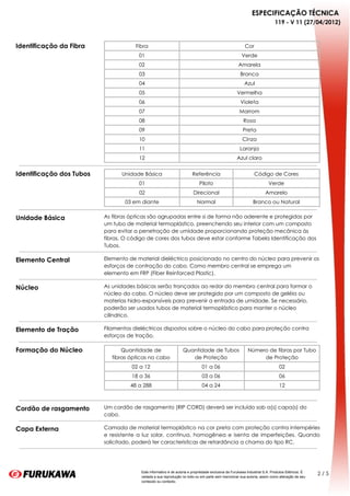 Este documento especifica os requisitos técnicos para cabos ópticos do tipo CFOA-DD fabricados pela Furukawa. Descreve detalhadamente as características de construção, materiais, dimensões, marcações e requisitos para este tipo de cabo óptico.