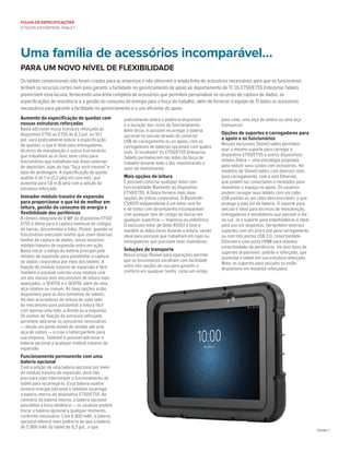 O documento descreve o tablet ET50/55 criado para uso empresarial, combinando estilo pessoal com recursos corporativos como segurança, gerenciamento e captura de dados. Possui versões com Android ou Windows e é resistente para uso em ambientes internos e externos. Uma ampla gama de acessórios permite personalizar o dispositivo de acordo com as necessidades de cada função.