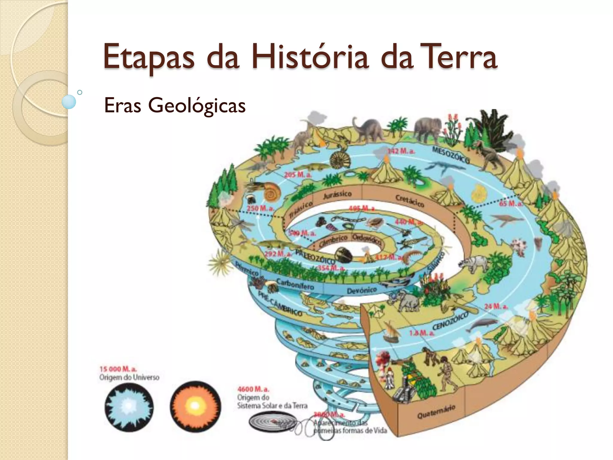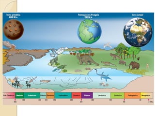 O documento descreve a Escala de Tempo Geológico dividida em Eras, com ênfase nas Eras Pré-Câmbrica, Paleozóica, Mesozóica e Cenozóica. Detalha os principais eventos que ocorreram em cada Era, como a evolução da vida, extinções em massa e mudanças climáticas.