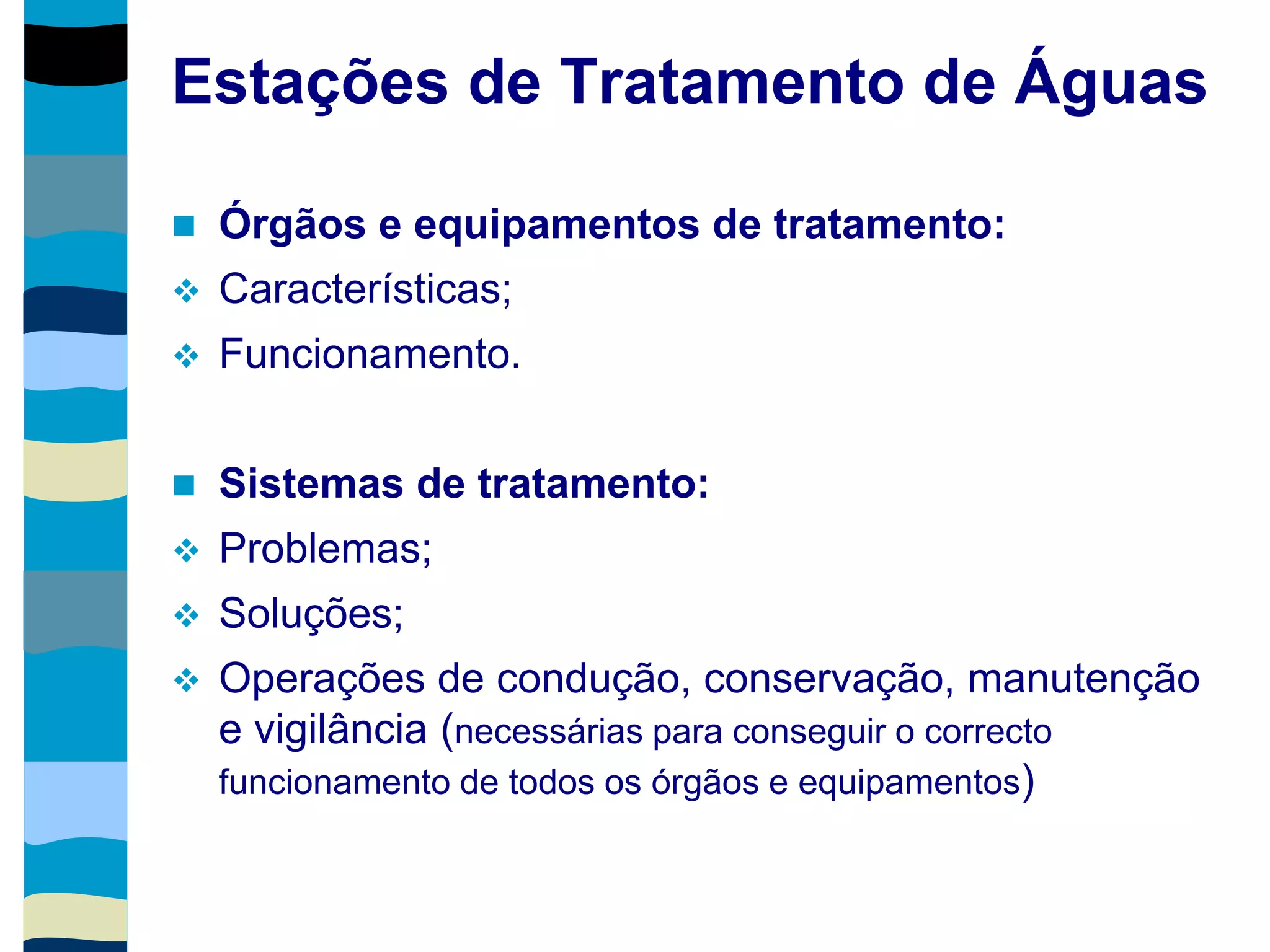 O documento descreve os principais componentes e operações de uma estação de tratamento de águas, incluindo órgãos de tratamento, sistemas de tratamento primário e secundário, ensaios de qualidade da água, e avaliação do funcionamento da estação.